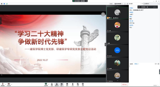 博士党支部于腾讯会议线上共同开展“学习二十大精神,争做新时代先锋”主题党日活动暨论文写作交流会。两个支部的党员和积极分子参加了本次会议,本次会议由黄越同志主持。