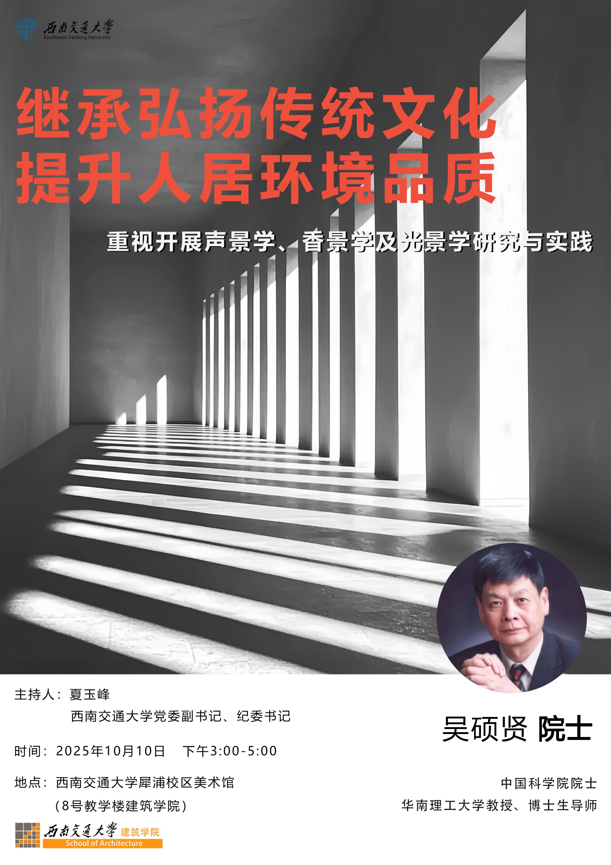 本次讲座,吴硕贤院士将结合其多年的前沿研究与实践,系统阐述如何通过声、香、光等感官维度的研究,继承并弘扬传统文化,为提升当代中国人居环境品质提供全新的科学视角与实践路径。