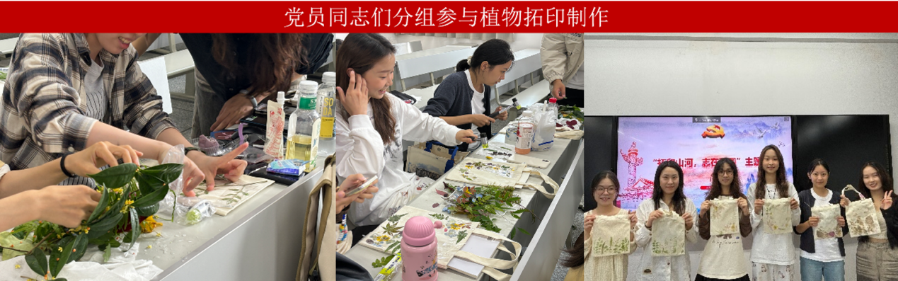 在理论学习后,活动进入了植物拓印的实践环节。党员们在骆禧同志的指导下,了解到植物拓印的历史和发展背景。从宋代文人以叶片为材料进行文房四宝的拓印制作,到这一技艺被广泛应用于植物学研究和艺术创作中,植物拓印不仅是手工展现的一种形式,更是一种文化的传承。通过拓印植物的形态特征,党员们可以更加直观地感受风景园林专业背景下最真实的自然洗礼,更能在自然中体悟文化,在文化中激发爱国热情。